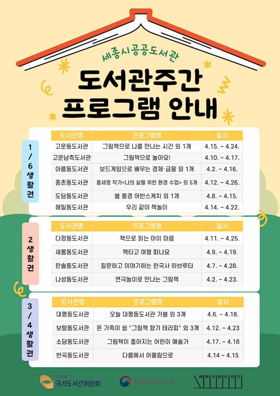 권역별로는 1·6생활권 도서관에서 ▲홍세영 작가와의 만남(종촌) ▲보드게임으로 배우는 경제·금융(아름) ▲봄 풍경 어반스케치(도담) 등의 프로그램을 만나볼 수 있다.