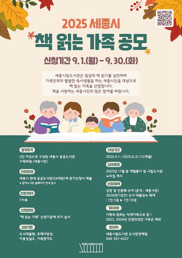 세종시립도서관이 내달 1일부터 30일까지 가정에서 책을 매개로 소통하고 활발한 책읽기를 실천하는 시민을 발굴하기 위해 ‘2025년 책 읽는 가족 공모’를 진행한다.