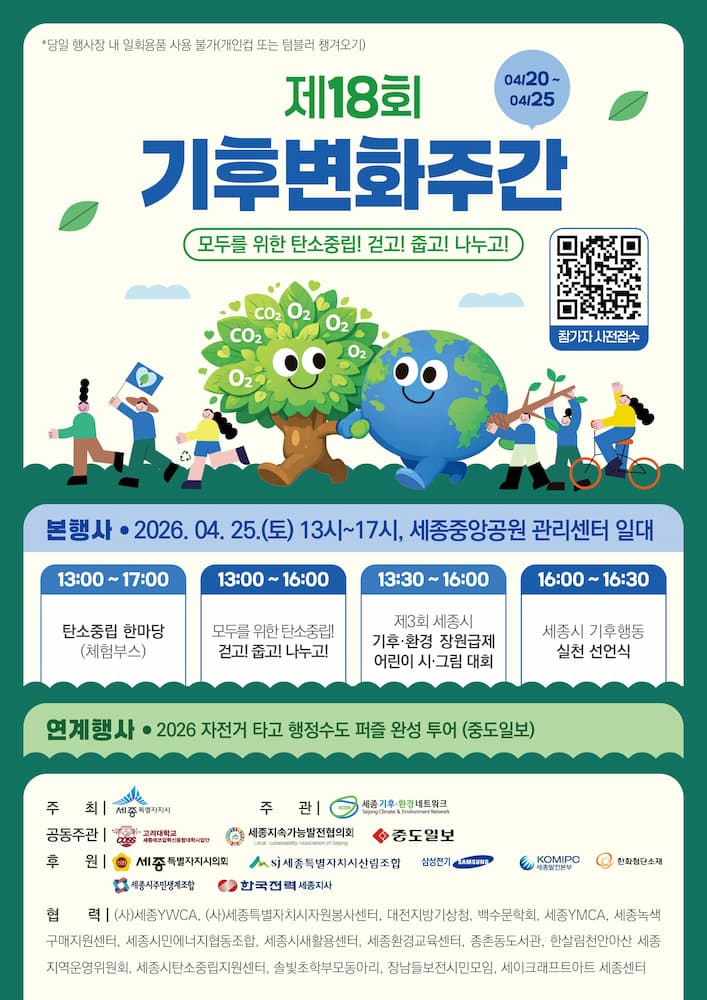 세종특별자치시(시장 권한대행 김하균)가 20일부터 25일까지 6일간 중앙공원 일대에서 ‘제18회 기후변화주간’ 행사를 개최한다.