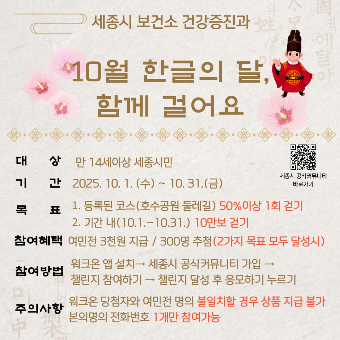 세종특별자치시 보건소가 1일부터 31일까지 한글날을 맞아 ‘10월 한글의 달 함께 걸어요’ 걷기 도전 행사를 운영한다.